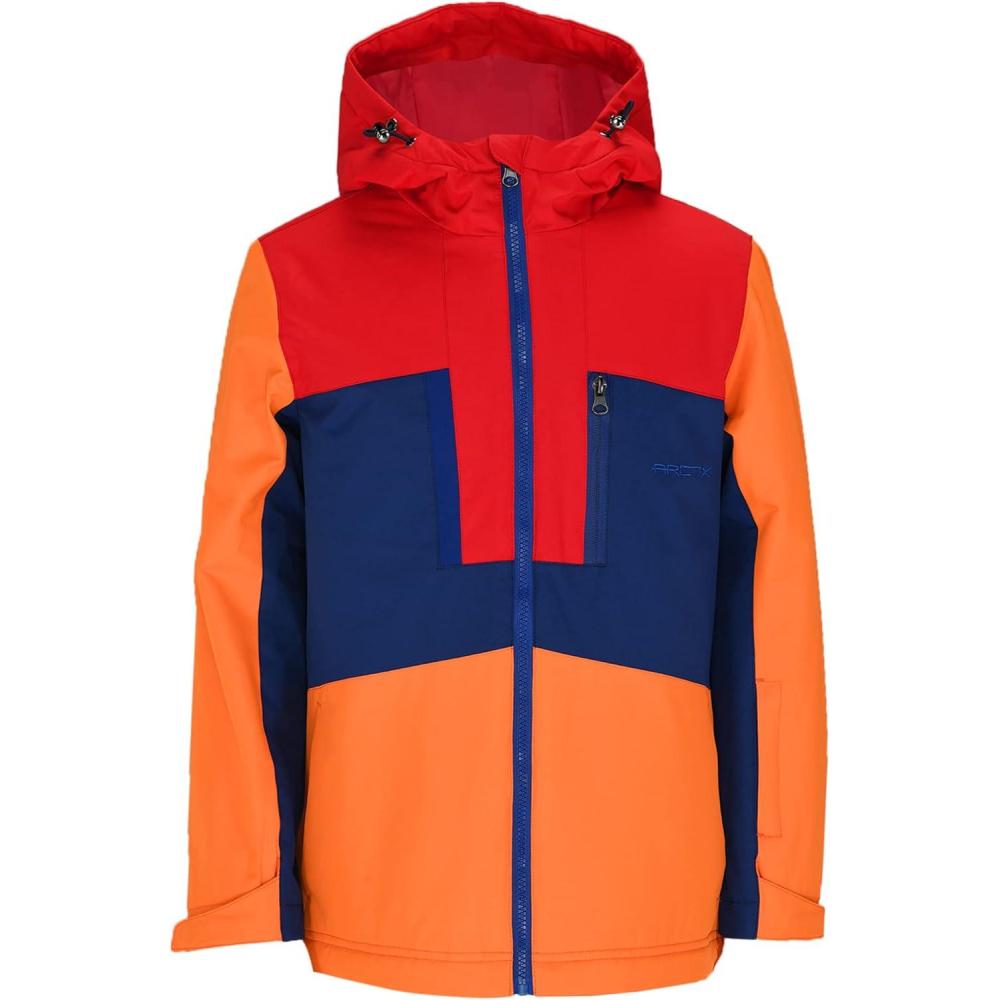 This vibrant, color-blocked jacket ensures warmth during outdoor activities. It combines wind-resistant technical fabrics with ultra-warm ThermaTech insulation and a full-coverage hood to shield from elements. Key features include a 100% Polyester Dobby shell, 100% Polyester 210T Taffeta lining, and 5oz/m2 100% Polyester ThermaTech insulation, rated for temperatures between -20F to 35F. It has sealed seams, an interior pocket, handwarmer zip pockets, and is machine washable.